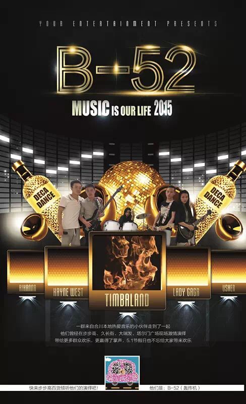 就在合川,就在今晚,B-52(轰炸机)乐队,空降步步高埃菲尔铁塔,为大家送上一场视觉听觉全方位的饕餮大餐,让你在这个五一为B-52乐队而骄傲,为B-52乐队而疯狂。