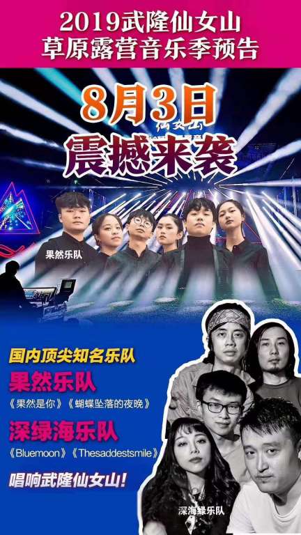 仙女山草原露营主题音乐周燃爆现场 去仙女山免费听音乐 尽情享受夏日狂欢 据悉,本周音乐周主题为激情电音趴!作为一场融合“科技”与“电音”融合的音乐盛宴,本次电音节更是邀请到了Deep Green Sea(深绿海)和Wonderlust King两支资深乐队。届时,游客可与众多帅哥美女一起,跟着音乐摇摆,拥抱青春与激情,在美丽清凉的仙女山感受DJ的魅力。