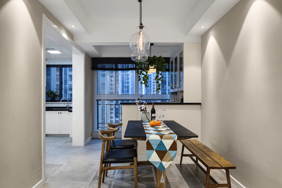 小户型的餐厅一侧做上了到顶的柜子,另一侧的墙面同样可以利用起来做装饰,比如文化砖、木饰面板、壁纸等,让餐厅看起来更美。