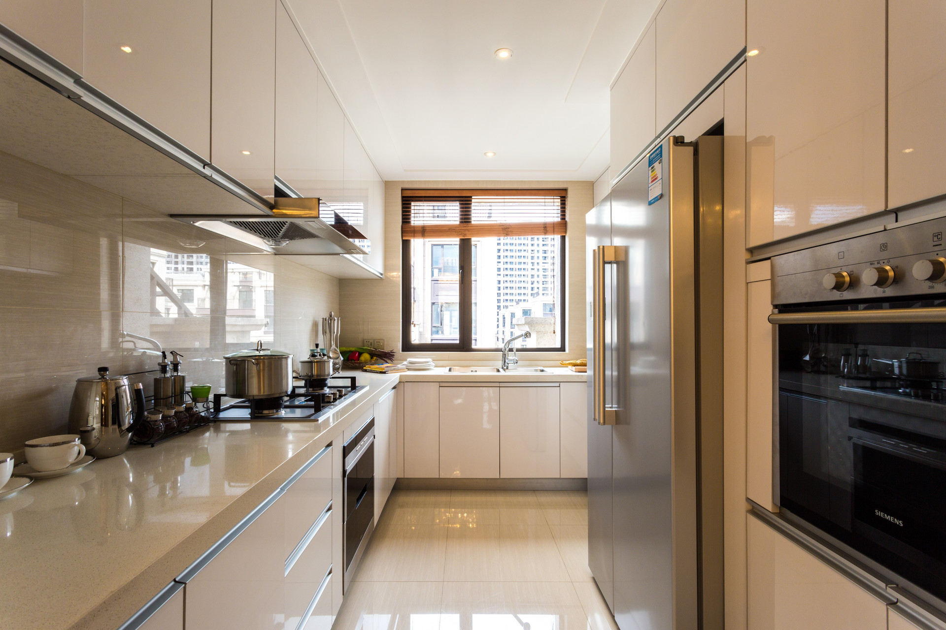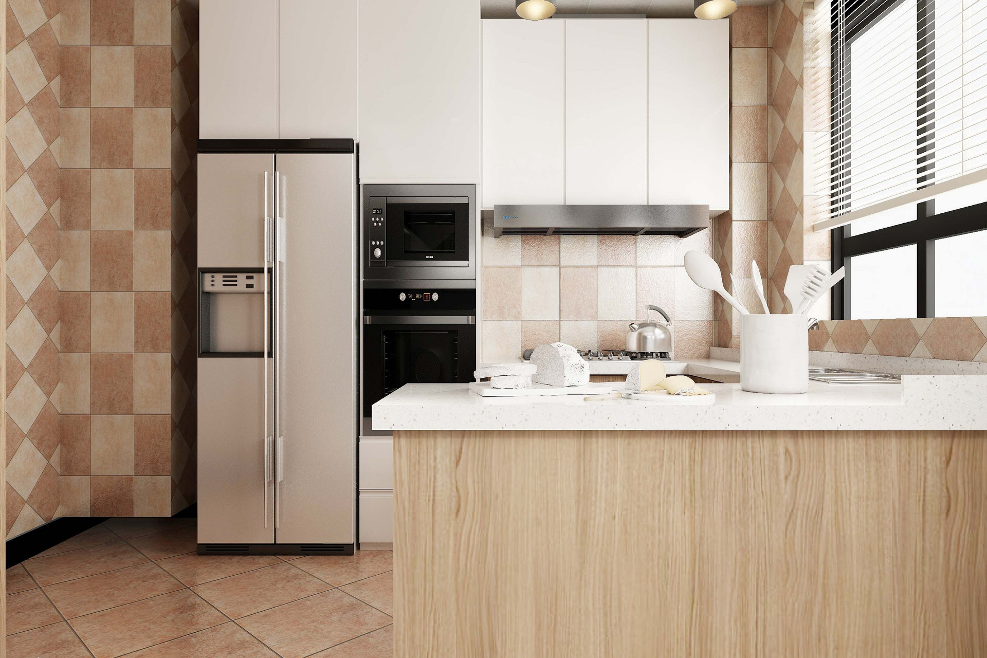 选择单柜门冰箱的,只要在柜子的一侧留出一个65cm左右宽度的空间,就能把冰箱给嵌入进去,顶部可以加上吊柜,让收纳空间变的更为充足。
