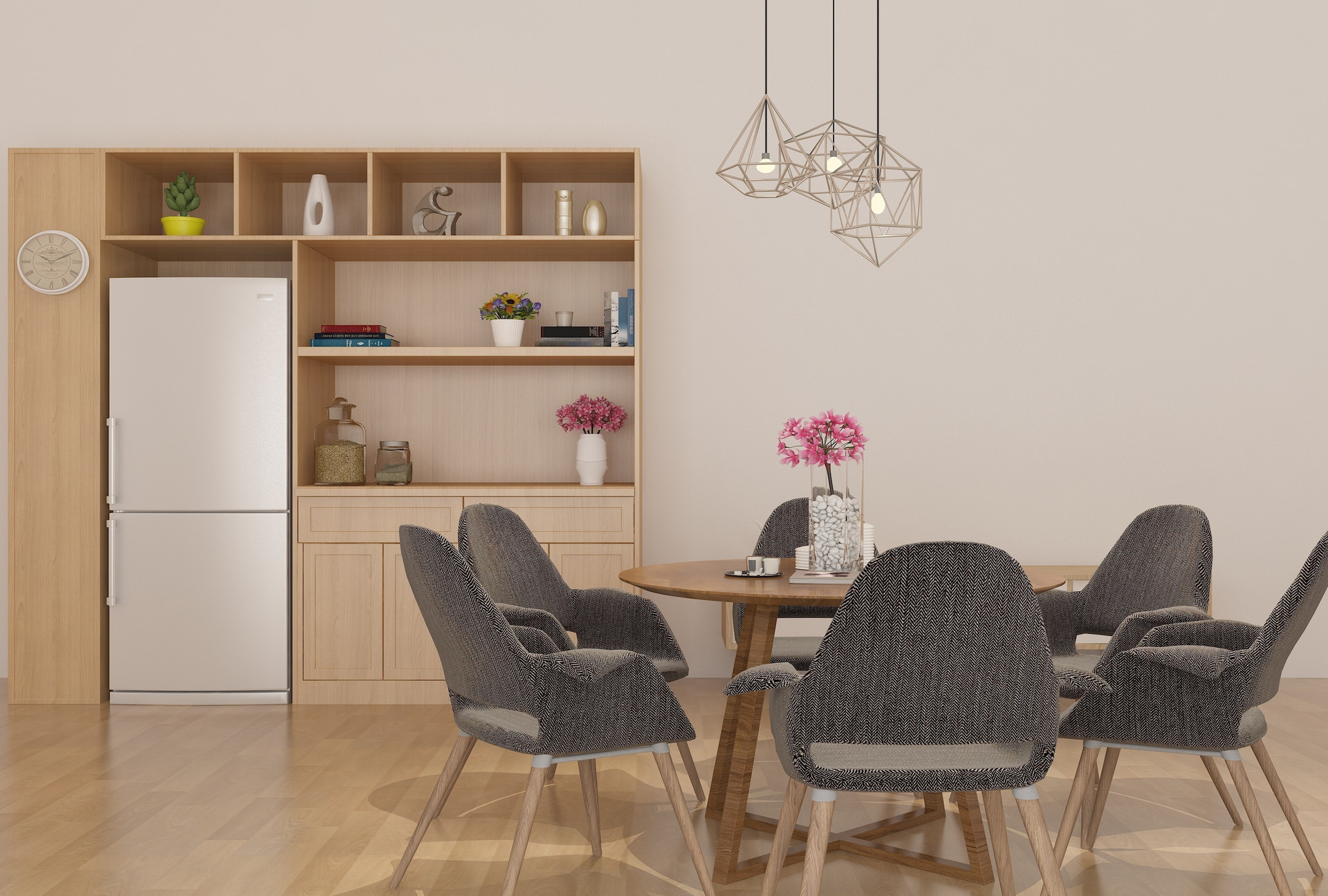 小户型的餐厅面积不是很宽敞,但大部分的屋主还是会选择做上一个到顶的餐边柜,用于满足餐厅的收纳需求。而冰箱就是很适合嵌入餐边柜当中的,毕竟小户型的厨房也很小,不适合放冰箱。