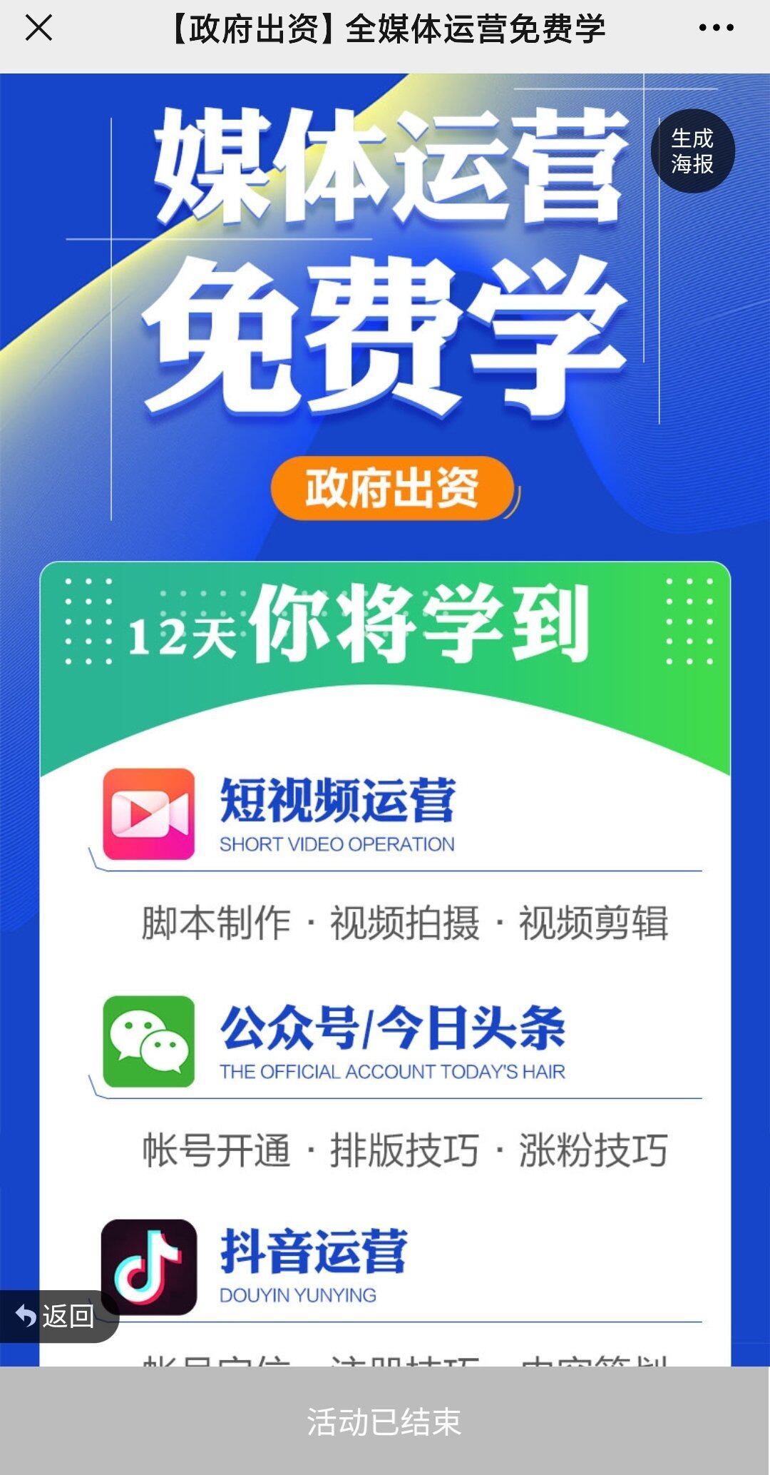 今天!2021年9月1日!经过两个月的报名时间,又因为疫情的耽搁,全媒体运营师免费培训班终于正式开班上课啦!!! 此次全媒体运营培训班涵盖了全媒体传播概论、文案策划与创作、美学设计及鉴赏、短视频制作与包装、新媒体平台运营、短视频平台运营等共计11大模块。全程免费培训,不收取任何费用,并且还有证书拿哦!