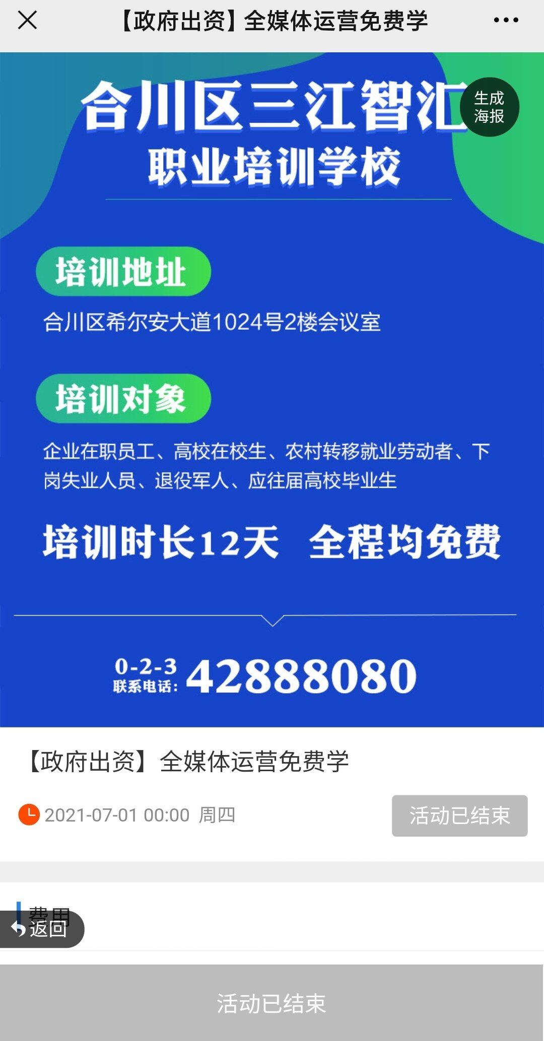 大家肯定会问为什么我们要筹办此次培训呢?当然是为了帮助我们合川就业的人民提高工作能力、拓宽就业渠道哦。同时还可为相关的培训机构明确全媒体运营师的培训目标与培养方向,提高大家的就业竞争力哦。好了话不多说,让我们祝贺参加此次的培训的人员们都取得一个圆满的成绩哦! 后期我们还会有其他的培训哦,感兴趣的小伙伴们可以持续关注我们哦,我们都会及时发布相关信息的哦! 第一期的全媒体运营培训班已经开课了,第二期报名现在开始啦!大家赶紧扫描下方二维码报名吧!!! 提示:长按二维码识别详情