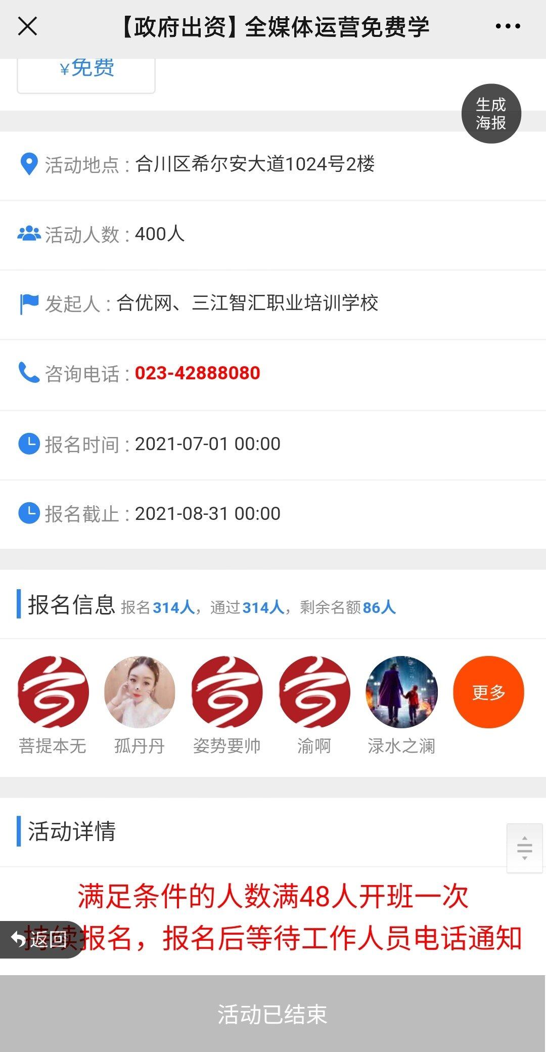 本次活动主要是由政府出资、合优网和三江智汇职业培训学校负责招募的一次免费的、面向合川大众的一次免费培训!截止今日,共有314人报名,最终审核通过、满足条件且成功获得培训资格的共有48人。