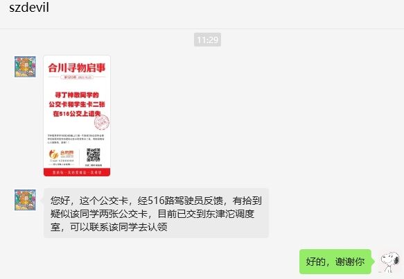 经热心网友反馈,你的学生卡和公交卡已交到东津沱公交车调度室,请前往领取。如不清楚调度室位置,可添加合优网圈圈微信:heiyouwang666.。发送定位给你。